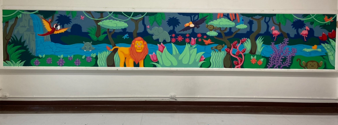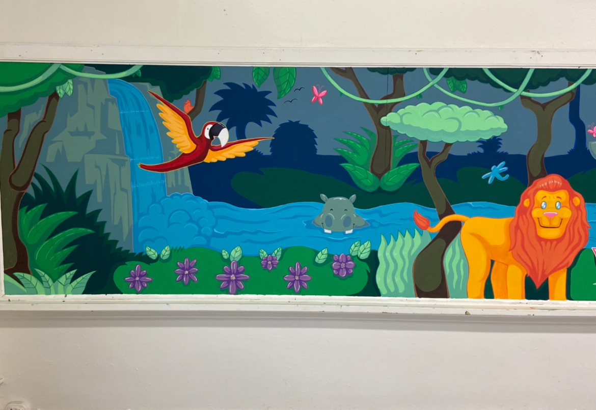 This mural was painted on an old classroom chalkboard, about 12 feet long and 3 feet high. It was made for a two-year-old room in a Jersey City daycare. I wanted it to feel bright, friendly, and full of life, so I painted cheerful safari animals, colorful flowers, and playful bugs. The goal was to create a happy space that makes the kids feel welcome and curious every day.